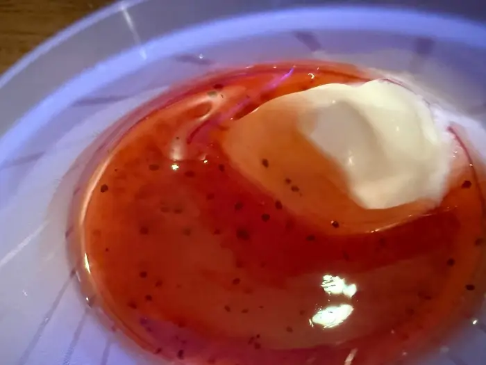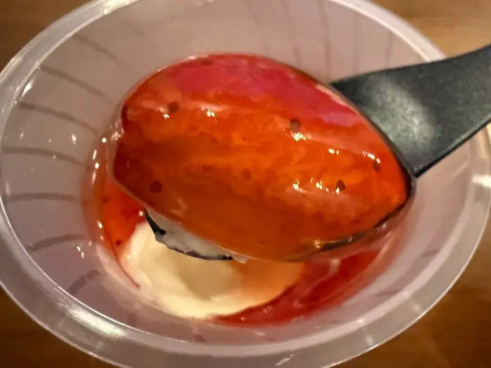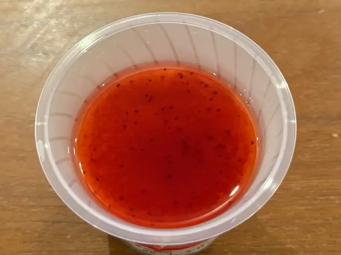 ふたを開けると、まず甘酸っぱい苺の香りがふわりと広がります。この時点で、すでに期待感が高まります。見た目は非常にシンプル。カップの上層を覆う鮮やかな赤い苺ソースが食欲をそそります。
