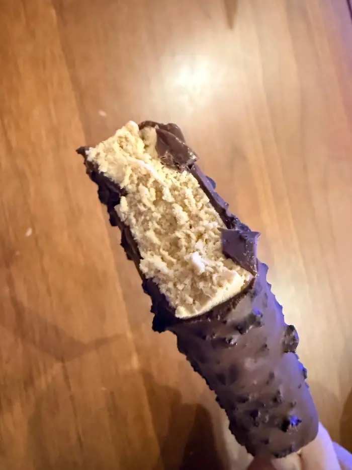 早速ひと口。まず感じるのは、外側のチョコレートコーチングの「パリッ」とした小気味よい歯ごたえです。そしてすぐさま、発酵バターが使われたココアクッキーの「ザクザク」とした食感が追いかけてきます。このクランチの食感が、食べていて本当に楽しいんです。
