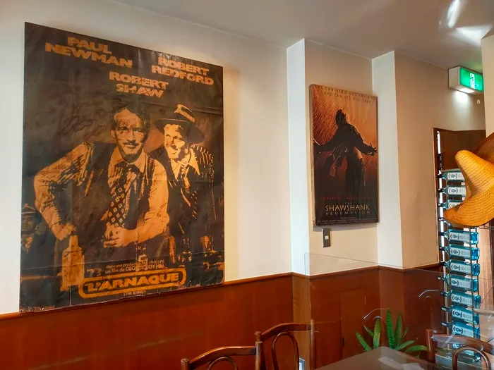階段を上ると、そこは木の温もりを感じる落ち着いた空間。壁には映画『スティング』をはじめとするポスターが飾られ、帽子掛けには店名の由来となった麦わら帽子が。
