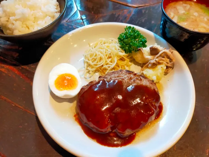 ハンバーグに箸を入れた瞬間、じゅわ~っと肉汁があふれ出します!玉ねぎがたっぷり入ったパティはふっくらと柔らかく、家庭的な優しさと肉の旨みが口いっぱいに広がります。野菜スープやデミグラスをブレンドしたという特製ソースは、甘みとスパイスのバランスが絶妙で、ご飯がどんどん進む美味しさ。しかも、ランチタイムはご飯が1杯おかわり無料という嬉しいサービスも。