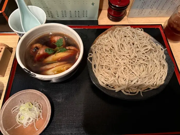 私たちは数あるメニューの中から、事前情報で美味しいと絶賛されていた「鴨せいろ」を注文。しばらくして運ばれてきたお盆の上には、艶やかに輝く蕎麦と、湯気の立つ熱々のつけ汁が鎮座していました。