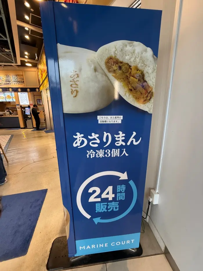 「あさりやcafe」の店頭だけでなく、同じフロアにはお土産用の冷凍「あさりまん」を販売する自動販売機も設置されていました。