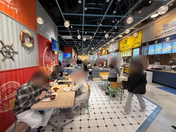 食事をした5階のフードコート「MARINE COURT」は、海をテーマにした内装で、明るく開放的な空間でした。窓際の席からは東京湾を一望でき、景色を楽しみながら食事をすることができます。