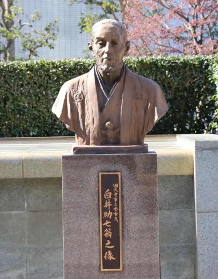 ひときわ目を引くのが、旧大宮市の名誉市民である白井助七(しらい すけしち)翁の胸像です。