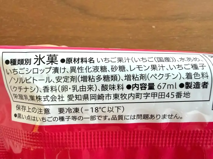 | 原材料名 | いちご果汁(いちご(国産))、水あめ、いちごシロップ漬け、異性化液糖、砂糖、レモン果汁、いちご種子など |