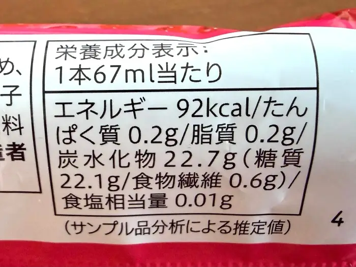| 栄養成分(1本あたり) | たんぱく質 0.2g, 脂質 0.2g, 炭水化物 22.7g (糖質 22.1g, 食物繊維 0.6g), 食塩相当量 0.01g |
