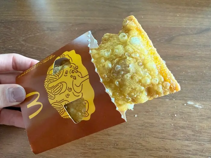 専用の紙パッケージからパイを取り出すと、揚げたてのパイ生地の香ばしさと共に、甘いキャラメルの香りがふわっと漂ってきました。この時点で、甘いもの好きにはたまらない期待感が高まります。
