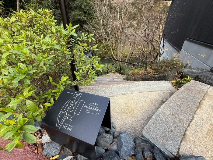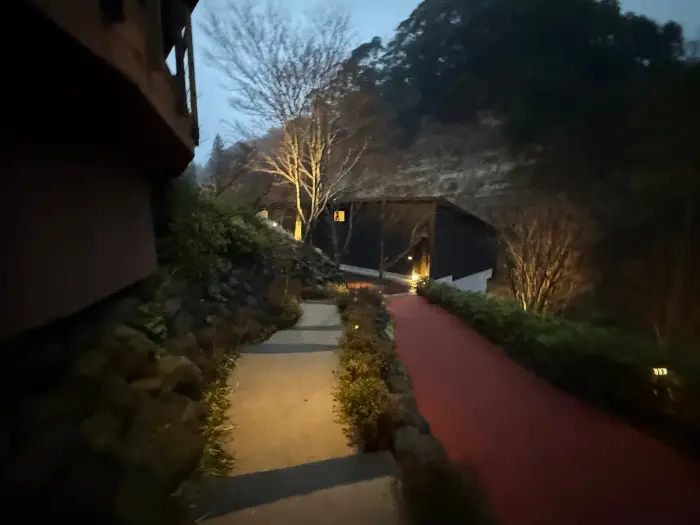 この道のりがまた幻想的で、まるで秘密の隠れ家に向かうようなワクワク感がありました。お部屋の詳細は別の記事でじっくりご紹介しますが、渓谷の景色を独り占めできる最高のロケーションです。
