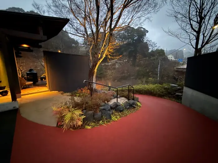 今回私たちが宿泊したのは、本館から少し離れた「リバーサイドヴィラ」。チェックイン後、ライトアップされた小道を下っていきます。