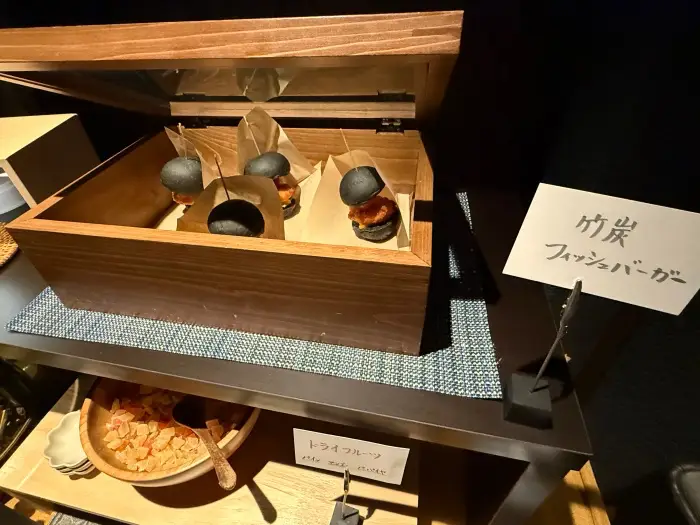 夕食前には生ハムやチーズ、カヌレといったおつまみを。夕食後には、竹炭を使ったミニフィッシュバーガーやドライフルーツ、チョコレートなどが並びます。