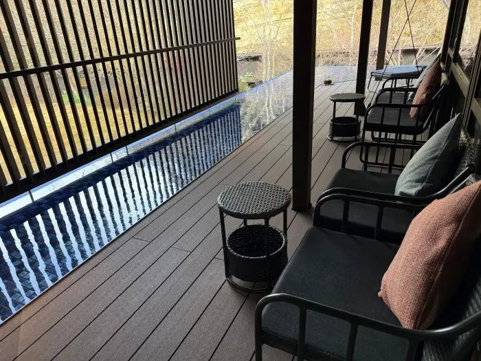 コンセプトは「Empty your mind – like water.」。その言葉通り、渓谷のせせらぎや木々のざわめきに耳を澄まし、心を空っぽにしてリラックスできる空間が広がっています。