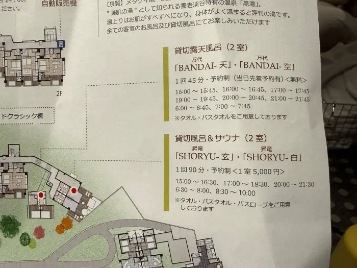 SHINRA YORO VALLEYには、全室露天風呂に加えて、複数の貸切風呂があります。無料で利用できる貸切露天風呂「BANDAI」(2室)と、有料(90分/5,000円)のサウナ付き貸切風呂「SHORYU」(2室)です。