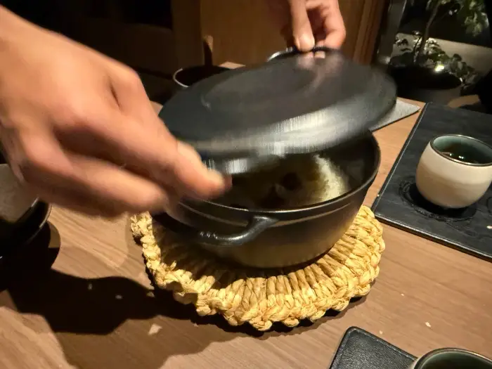 コースの締めは、なんと釜炊きのご飯。使用されているのは、素材の味を引き出すことで有名な「VERMICULAR」のライスポットです。
