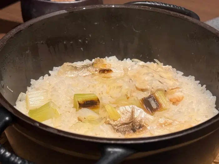 蓋を開けると、湯気と共にお米の甘い香りが立ち上ります。この日は魚とネギが乗った炊き込みご飯でした。