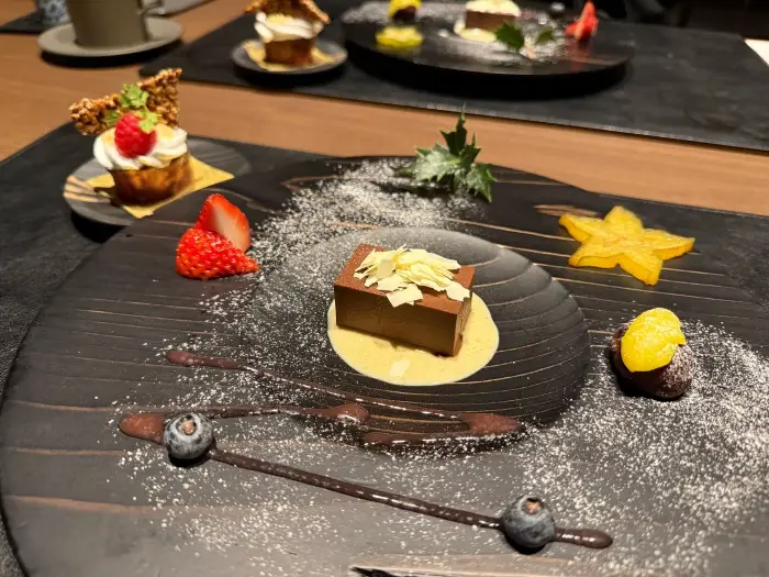 最後のデザートは、チョコレートムース。濃厚なピスタチオのソースと、フレッシュな苺やスターフルーツの酸味が絶妙なバランスです。