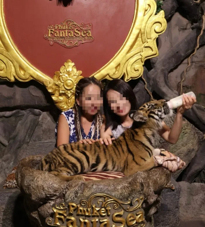 - ベビータイガーと記念撮影:ショーの会場「象王の宮殿」に入ると、ショーが始まる前に可愛いベビータイガーと写真が撮れるスポットが!こちらは800バーツ(約4,000円)でした。ふわふわの赤ちゃんトラに癒やされます 。