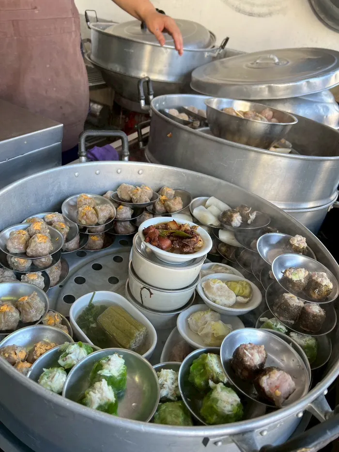 注文方法はとてもシンプル。店先にある蒸し器の前に立ち、ずらりと並んだ小さな器に入った点心の中から、食べたいものを指差して選ぶだけです。