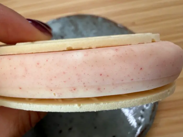 アイスを包むのは、ほんのりピンク色に染まったホワイトチョコレートコーチング。所々に見える赤い粒はストロベリーパウダーで、見た目にも可愛らしい印象です。