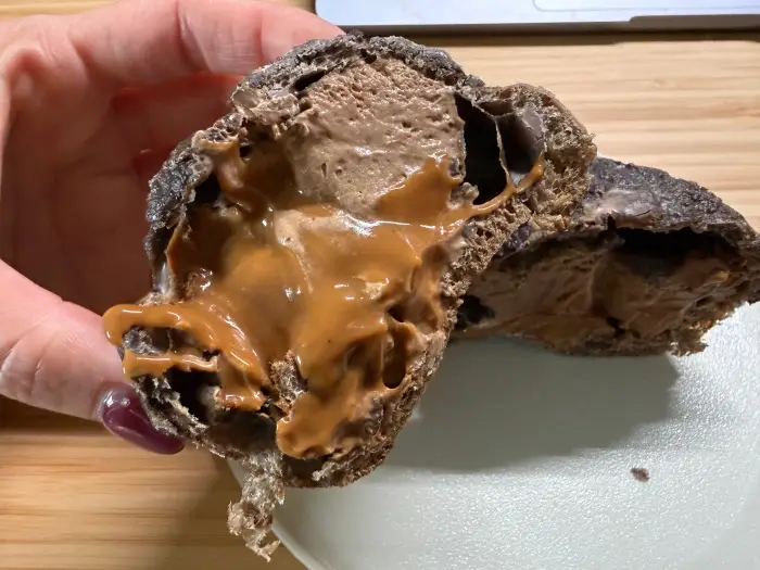 そして、中からは濃厚なショコラクリームと、ほろ苦さが際立つキャラメルソースがあふれ出します。想像していたよりも甘さが控えめで、キャラメルの苦みとショコラのコクが前面に出た、ビターで大人な味わいでした。