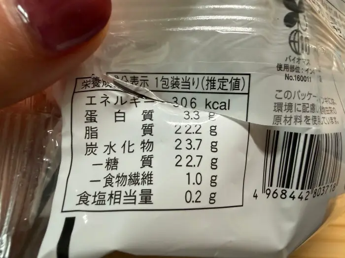 パッケージ裏面の栄養成分表示。購入の際の参考に。(写真を撮る前に開けてしまいました…汗)