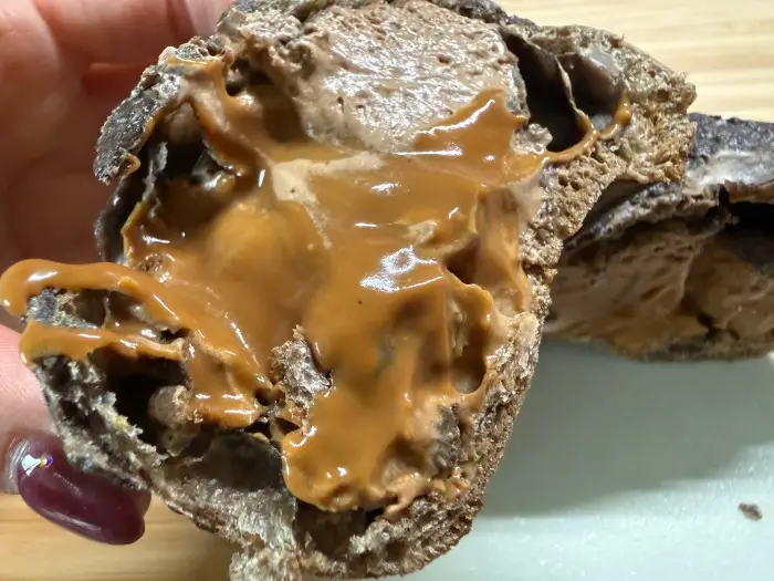 キャラメルソースが非常に滑らかなため、食べる場所や食べ方によっては、こぼれやすいかもしれません。特に、きれいに半分に割って食べようとすると、ソースが流れ出てしまう可能性があります。