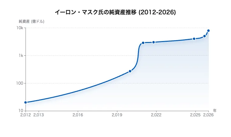 資産の推移は、テスラ株の動向に大きく左右されてきた。2012年に20億ドルで初めてフォーブスの長者番付に登場。特に2020年以降、テスラ株の上昇とともに資産は急拡大している。