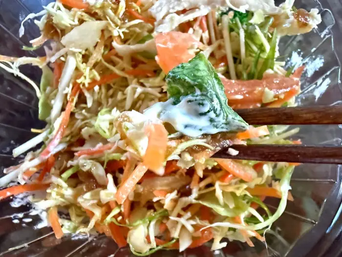 さらに、少量添えられたマヨネーズが、味にまろやかさとコクを加えてくれます。 ドレッシングをかけると、一気に食欲をそそる香りが立ち上ります。