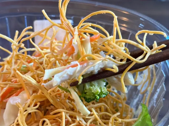 容器は上下二層に分かれており、上段に野菜や蒸し鶏、下段にパリパリの揚げ麺が入っています。