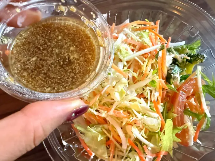食べる準備として、まずフィルムを外し、付属の「玉ねぎとすり胡麻の和風醤油ドレッシング」を全体にかけます。