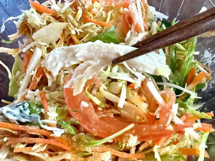 まずは、ドレッシングのかかった野菜や蒸し鶏、トマトなどをそのまま味わいます。シャキシャキとした野菜の新鮮さと、ドレッシングの味をダイレクトに感じます。