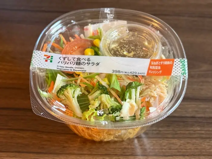 コンビニのサラダコーナーで、ひときわ存在感を放つ商品があります。セブン-イレブンの「くずして食べるパリパリ麺のサラダ」です。