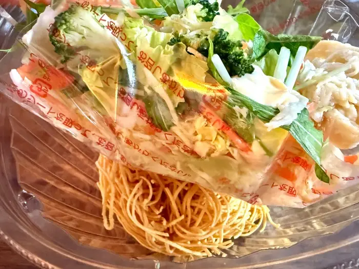 この間を一枚のフィルムが仕切っているため、食べる直前まで麺が野菜の水分を吸うことなく、揚げたての食感を保つことができるのです。