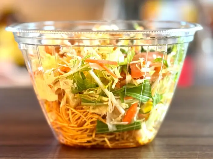 | 特徴 | パリパリの揚げ麺を食べる直前にくずして野菜と混ぜることで、食感を楽しめる食事系サラダ。醤油ベースのドレッシングが付属。 |