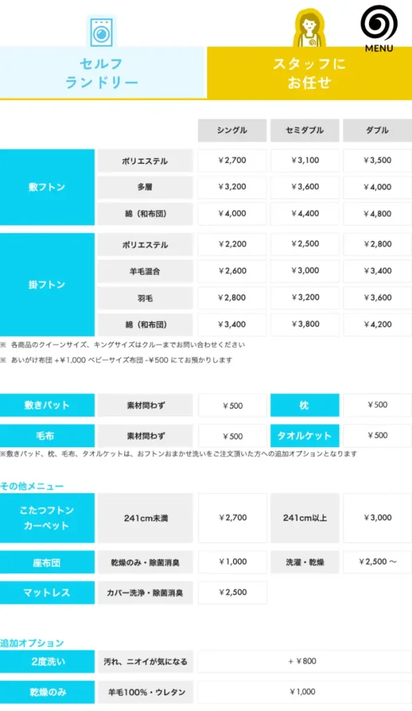 料金は、布団の素材やサイズによって細かく設定されています。一見複雑に思えますが、壁に大きな料金表が掲示されているので非常に明朗会計です。今回私がお願いしたのは、羽毛素材のセミダブルサイズの掛け布団と、敷きパッド、毛布の3セット。合計で4,200円でした。