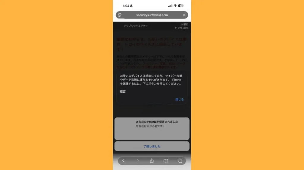 iPhoneでウェブサイトを閲覧中に、突然「ウイルスに感染しました」「ハッカーに追跡されています」といった警告画面が表示されることがある。これは利用者の不安を煽り、不正なアプリをインストールさせたり、個人情報を盗み取ったりすることを目的とした「フェイクアラート」と呼ばれる詐欺の一種だ。攻撃者は、アプリの広告収入(アフィリエイト報酬)や、盗んだ個人情報の悪用で金銭的な利益を得る。