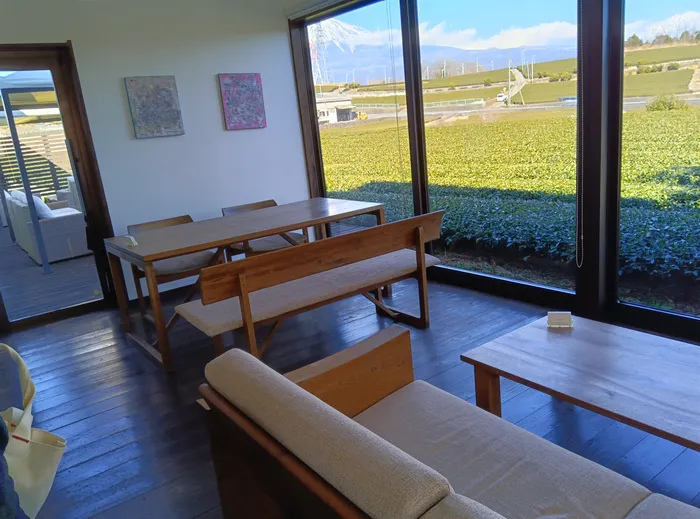 しかし一歩足を踏み入れると、大きな窓の向こうに広がる茶畑と富士山のパノラマに息をのみます。