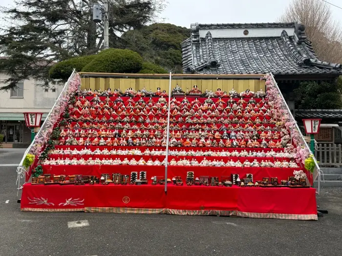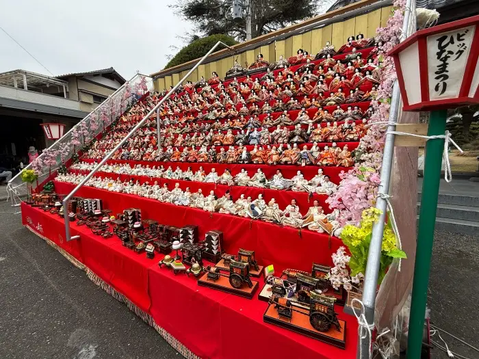 山門前の特設ひな壇には約600体のひな人形が飾られ、こちらも見ごたえ十分です。