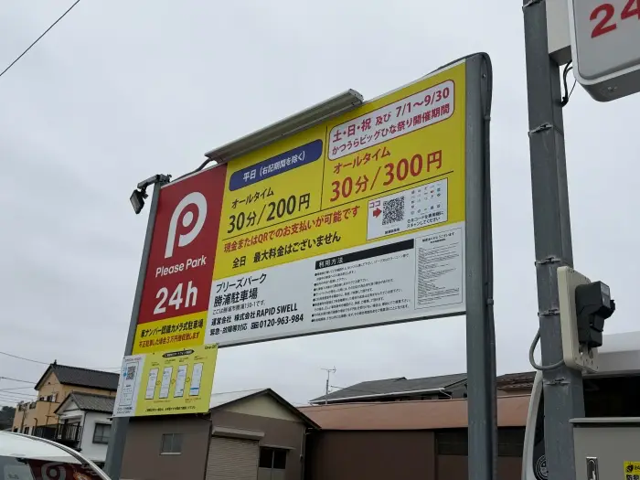 今回は車で向かいましたが、JR勝浦駅近くのコインパーキングを利用しました。看板を見ると、やはり祭り期間中は特別料金になっているようです。土日祝日は30分300円と、平日より少し割高。最大料金の設定もないため、長時間の滞在を考えている方はご注意ください。