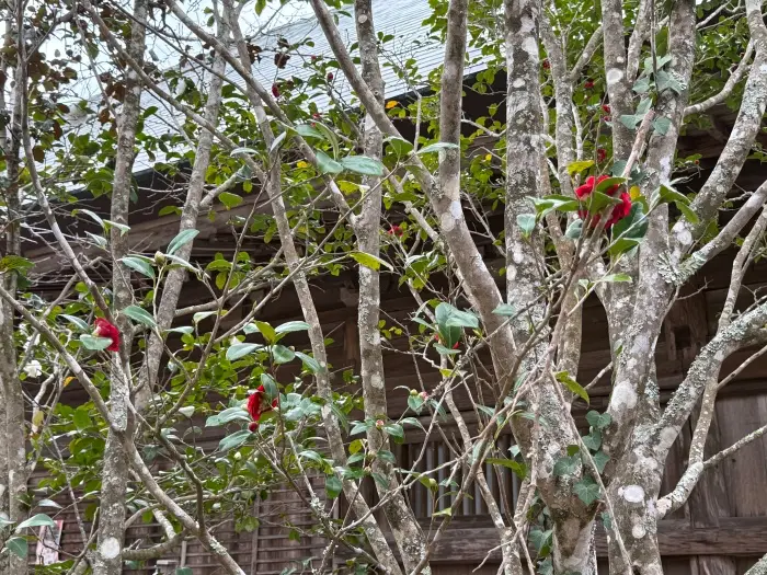 この先に花観音と旧尾形家住宅があるようです。参道の両脇には梅や椿の木々が立ち並び、訪れた時期にはちらほらと花が咲き始めていました。