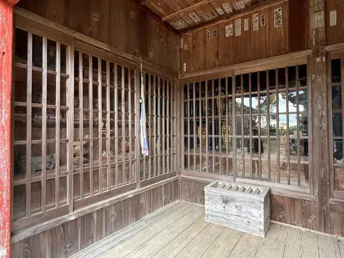 木造三間四方の堂内は柱を立てない開放的な造りで、中央には一間四方の鏡天井が張られています。今もなお釿(ちょうな)削りの床が残っているのが特徴で、内部には薬師如来と毘沙門天が安置されています。