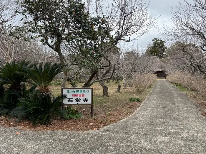 石堂寺は「東国花の寺百ヶ寺」の千葉14番に選ばれている花の名所でもあります。花観音の周囲には約200本もの梅の木が植えられており、2月下旬〜3月下旬の梅の季節には、茅葺き屋根と白梅・紅梅が織りなす絶景が広がるそうです。