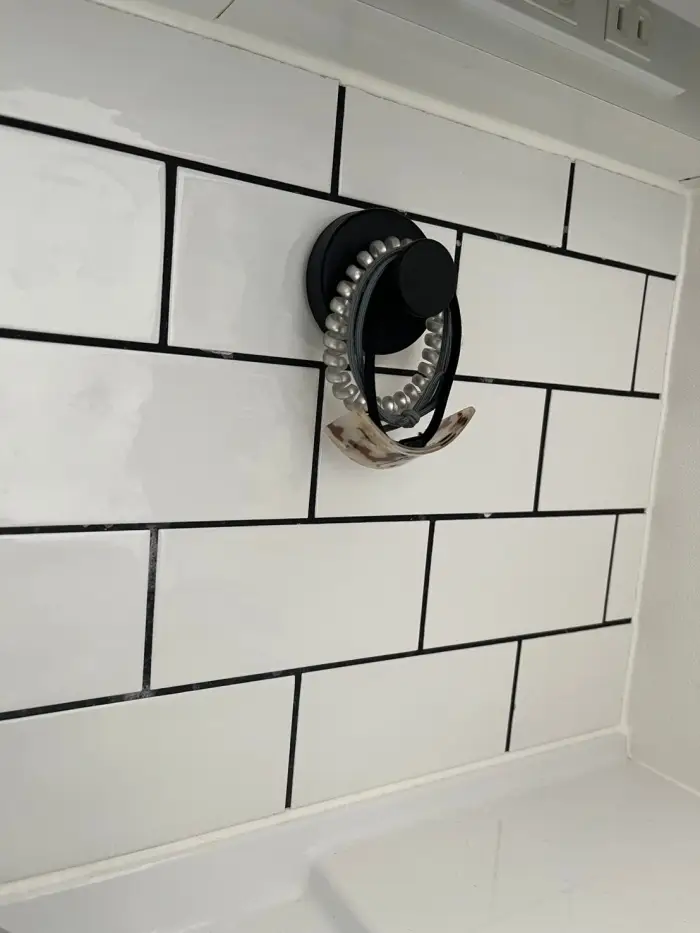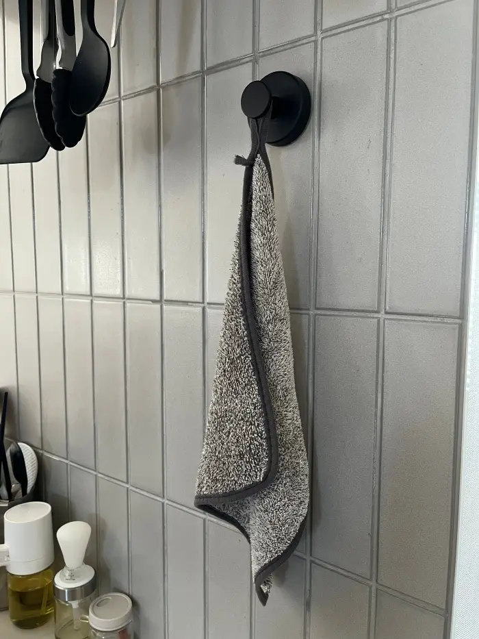 この吸盤フックのおかげで、手の届きやすい好きな位置にクロスを掛けられるようになりました。