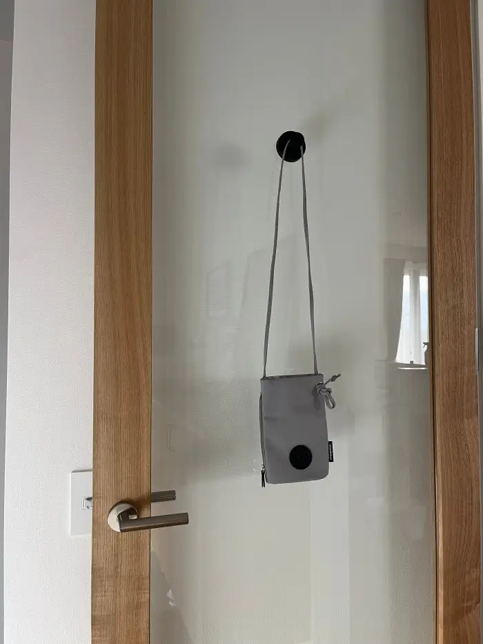 リビングのドア(ガラス面)につけて、バッグや上着の「ちょい掛け」スペースとしても重宝しています。