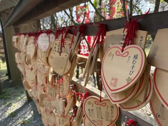 縁むすび絵馬:ハート形のかわいらしい絵馬に願い事を書いて奉納するスタイル。縁結び石の周りに掛けられた無数のハート絵馬は、それだけでフォトジェニックな光景です。