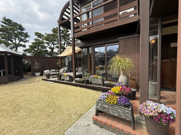色鮮やかな花壇と、くつろげるテラス席