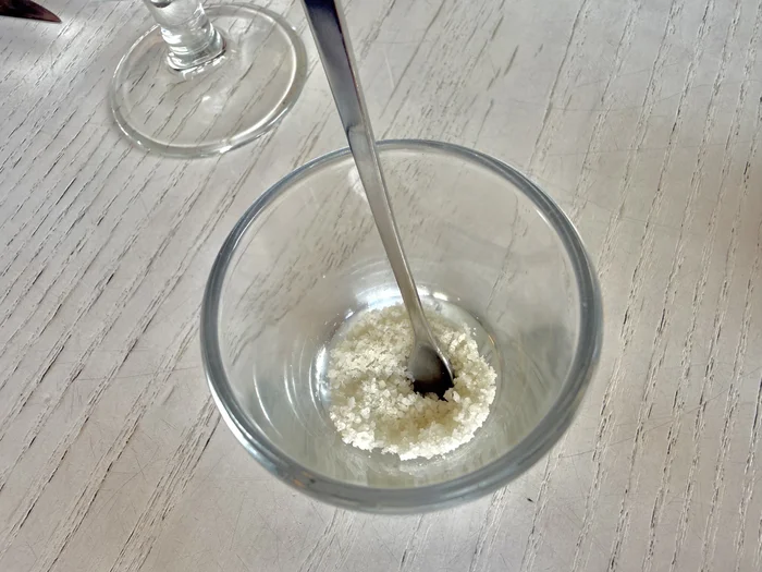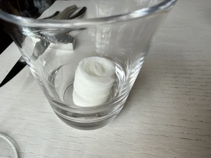 席に着いてまず驚いたのが「おしぼり」です。グラスに入った乾いたコイン状のものに、スタッフさんがお水を垂らすと、むくむくと膨らんでおしぼりになるスタイル!