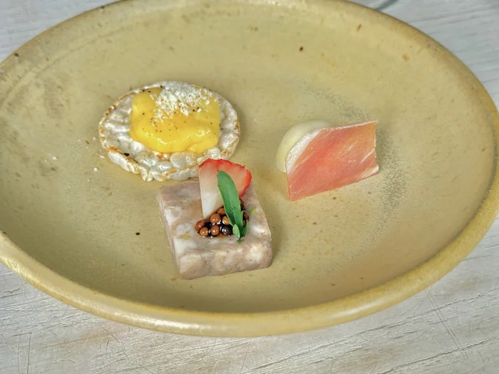 藤沢産いちごとエゴマのマスタードが乗ったオーガニックポークのカンパーニュ、モッツァレラチーズと藤沢産ハム、そして自然栽培の玄米クラッカーに乗った自然養鶏のスクランブルエッグ。