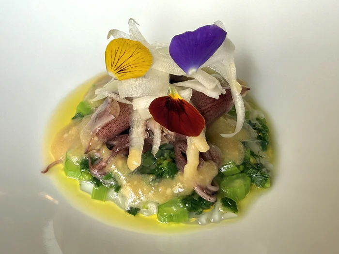 そして、オードブル1品目は、ほたるいか、菜の花、うどに、みそゼリーと花びらをあしらった一皿。盛り付けも美しくてみてるだけでも楽しい。