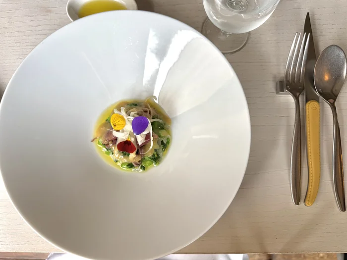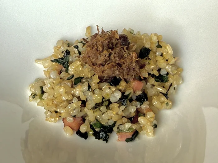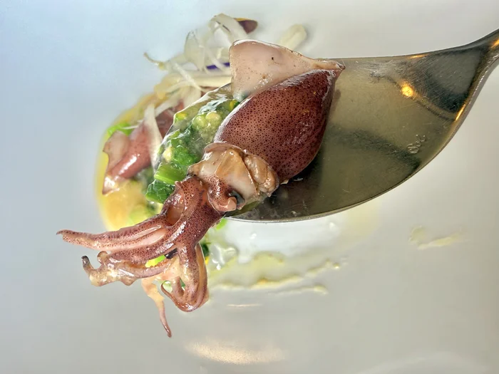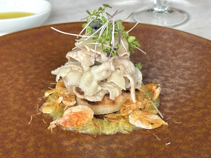 ふきのとうのソースと、お魚の醤油・レモン汁・白ワインを混ぜたソースが絡み合い、カリカリのえびの食感とふきのとうのほろ苦さが絶妙なバランスを生み出していました。