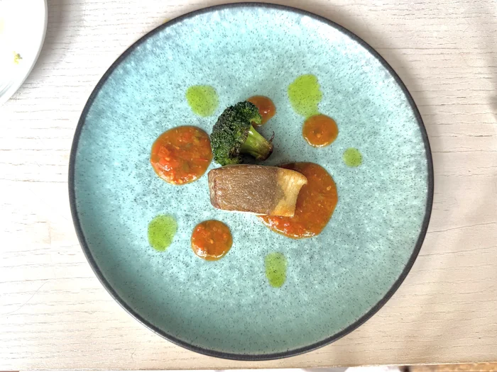 魚料理は「ぶりのポアレ」。焼きブロッコリーが添えられ、赤(トマトとケファ)と緑(ディルのハーブ)の2色のソースが目にも鮮やかです。ぶりの火入れ加減と塩味がちょうどよく、ソースとの相性も抜群でした。